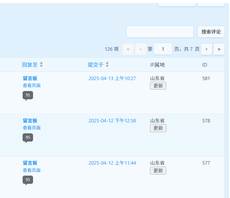 3.IP属地显示在评论区、后台评论页面,在后台提供一键更新获取IP属地功能。