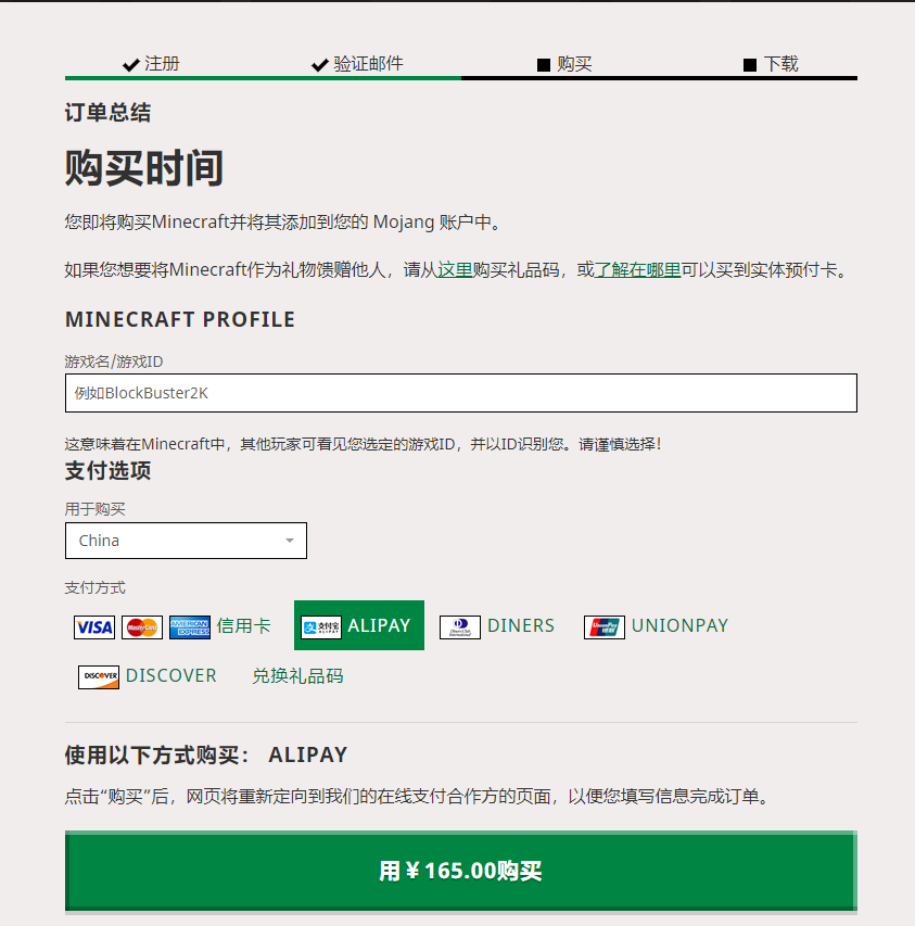 从6月27日开始,在 Minecraft官网 购买 Minecraft 正版 使用支付宝付款